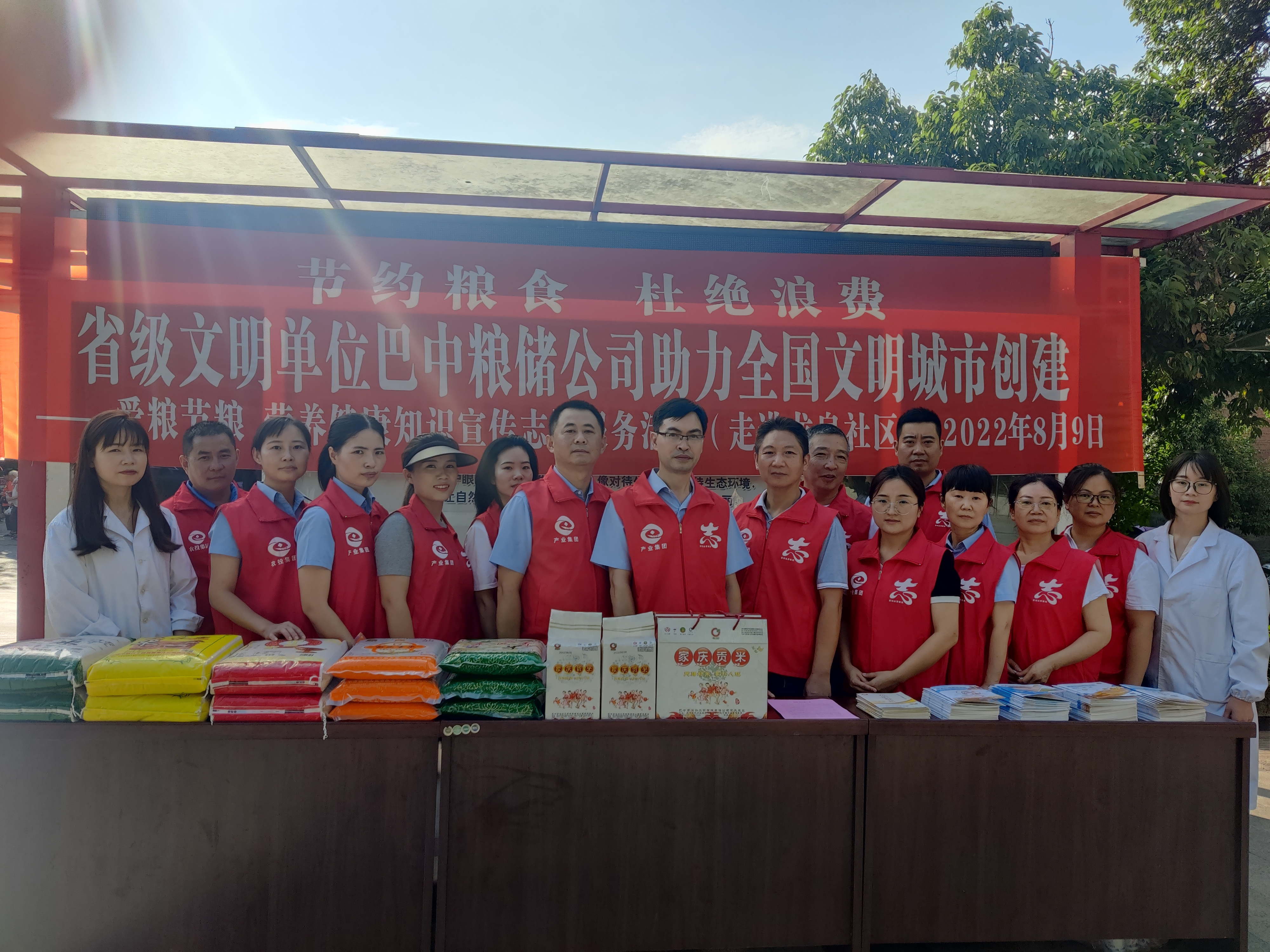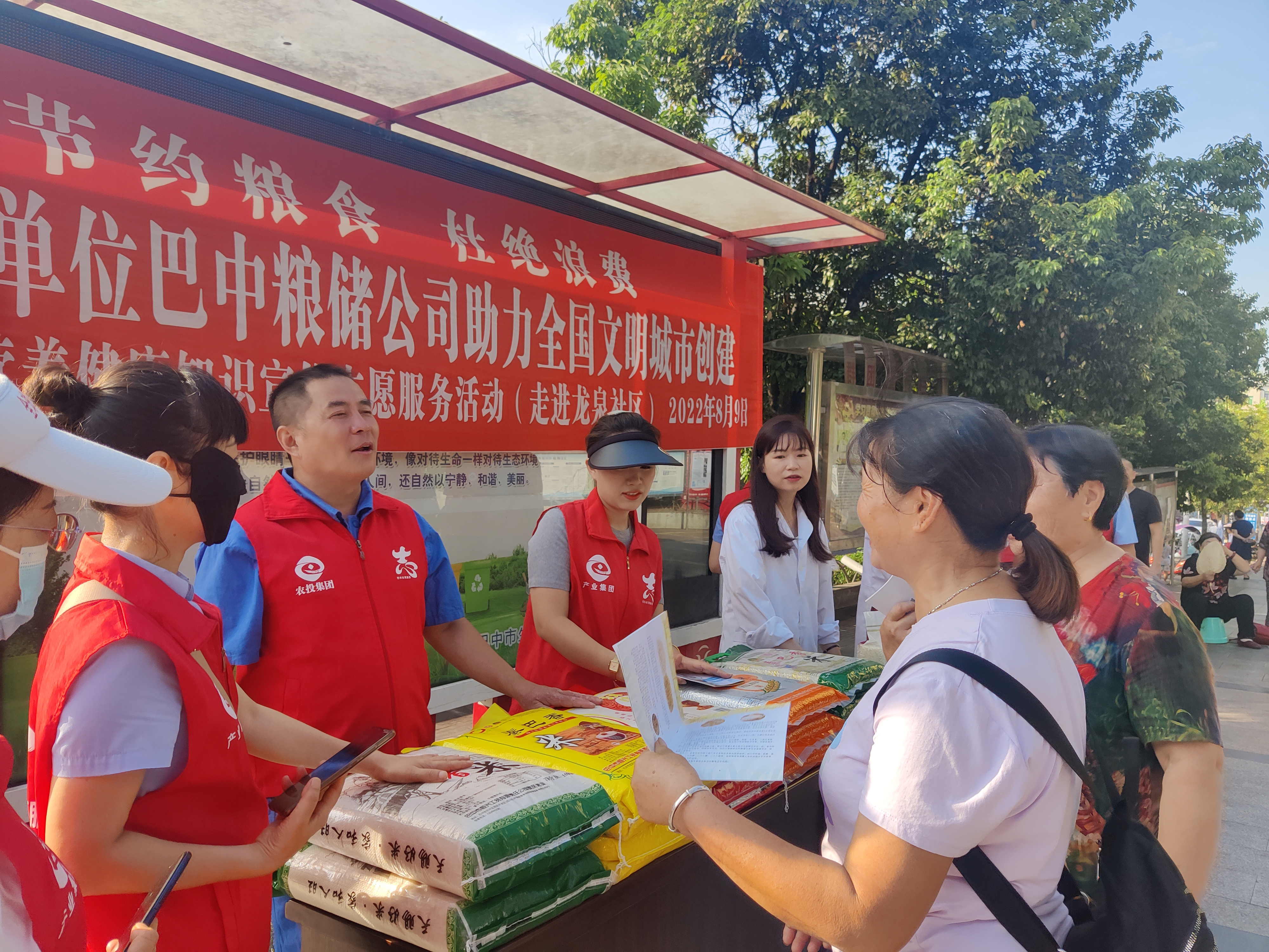 食為政首,糧安天下。為弘揚(yáng)中華民族勤儉節(jié)約傳統(tǒng)美德,深入開展愛糧節(jié)糧宣傳教育,助力巴中全國文明城市創(chuàng)建。8月9日,四川巴中國家糧食和物資儲備庫有限公司走進(jìn)巴州區(qū)江北街道龍泉社區(qū)開展“節(jié)約糧食·杜絕浪費(fèi)”志愿服務(wù)活動。